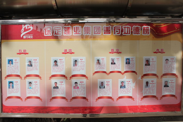 善行功德榜分为“互助、诚信、敬业、孝敬”四个方面,共计展示了道德模范17人,全部由分公司一线员工组成,他们勤勤恳恳、兢兢业业,在平凡的工作岗位上创造了不平凡的业绩。
